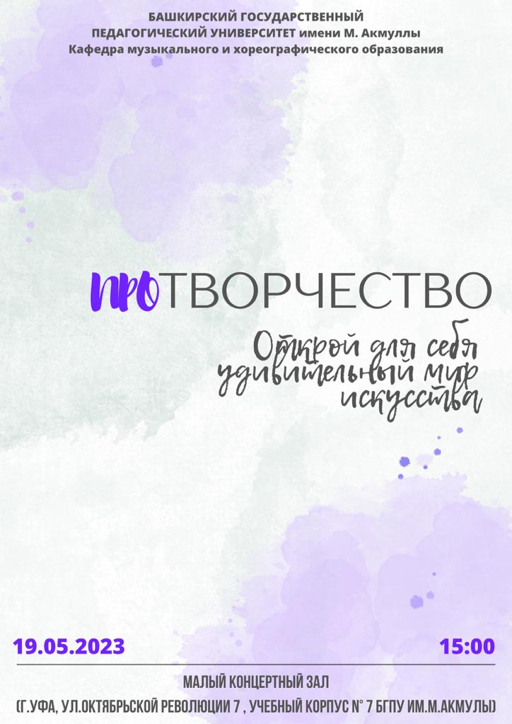 Концерт состоится 19 мая 2023 года в 15.00 ч. в Малом зале Акмуллинского университета (ул. Октябрьской революции, 7)