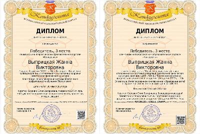 Поздравляем Выприцкую Жанну Викторовну, студентку 1 курса направления подготовки 49.03.02 Физическая культура для лиц с отклонениями в состоянии здоровья (адаптивная физическая культура), профиль (Физическая реабилитация), с достойным результатом участия в олимпиадах «Психологические методы обеспечения эффективности обучения» и «Интегрированное (инклюзивное) образование детей с ОВЗ (ФГОС)» на Всероссийском образовательном портале "Конкурсита" - дипломами победителя (3 место)!