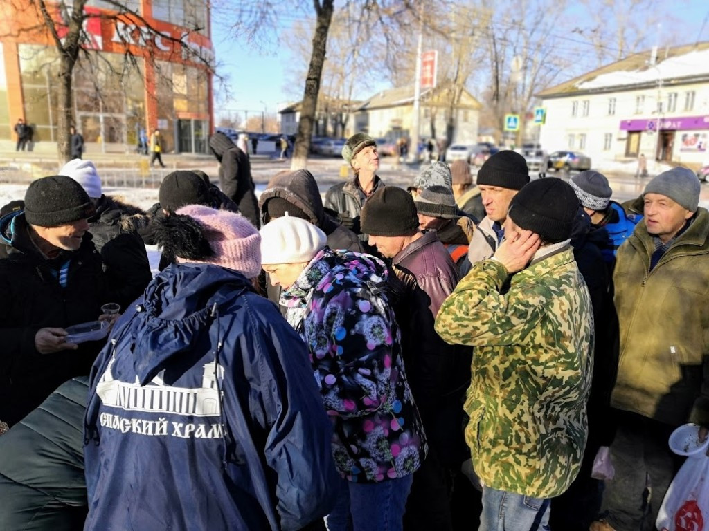 Приготовление комплексных обедов для бездомных осуществляется волонтёрами службы милосердия на протяжении 12 лет. С прошлого года — два раза в неделю.