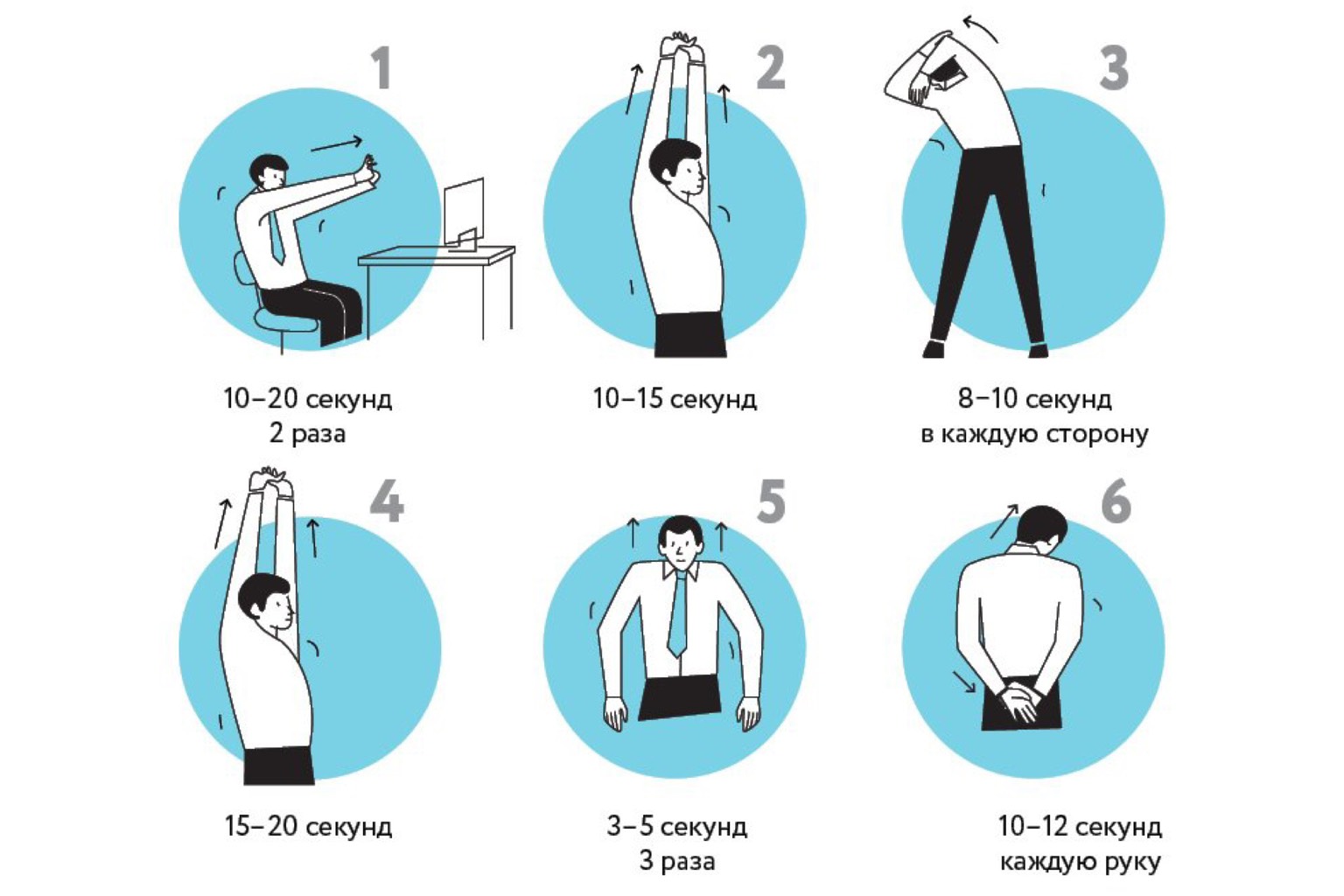 Опустите руки вдоль тела и начните вращать плечами, стараясь описать ими максимальный круг. Вращайте плечами сначала вперед, потом назад по 10 раз.